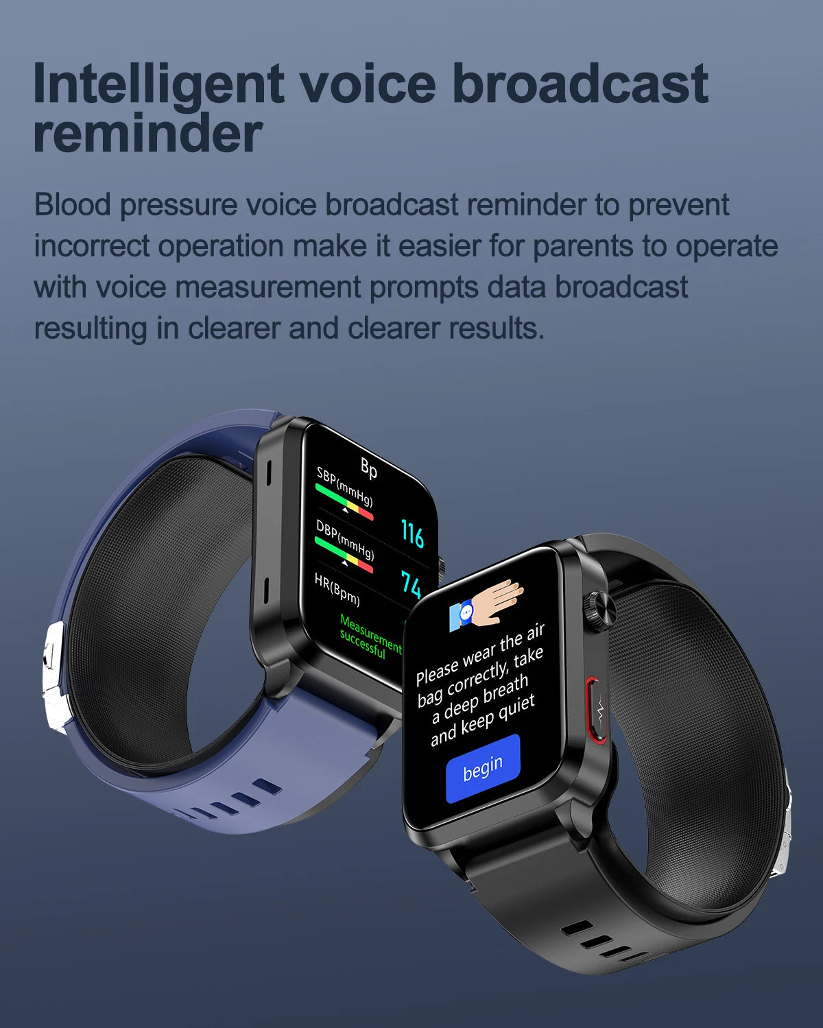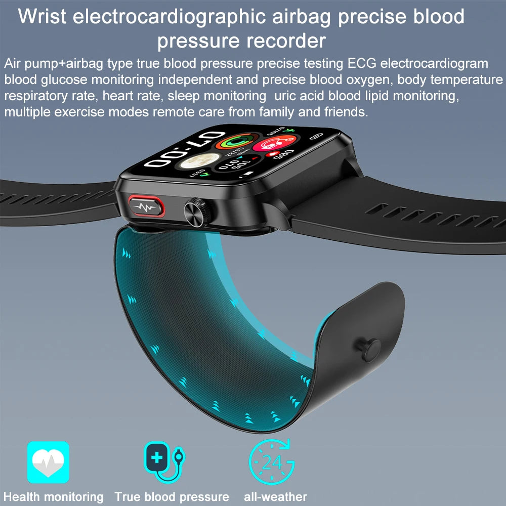 Air pump + airbag type real blood pressure accurate test, blood pressure voice broadcast, TPU ultra-thin comfortable airbag (removable), ECG electrocardiogram, AI intelligent diagnosis, blood GL monitoring, uric acid monitoring, blood lipid monitoring, body temperature monitoring, blood oxygen monitoring, respiratory rate, sleep monitoring, sedentary reminder and other health management functions.