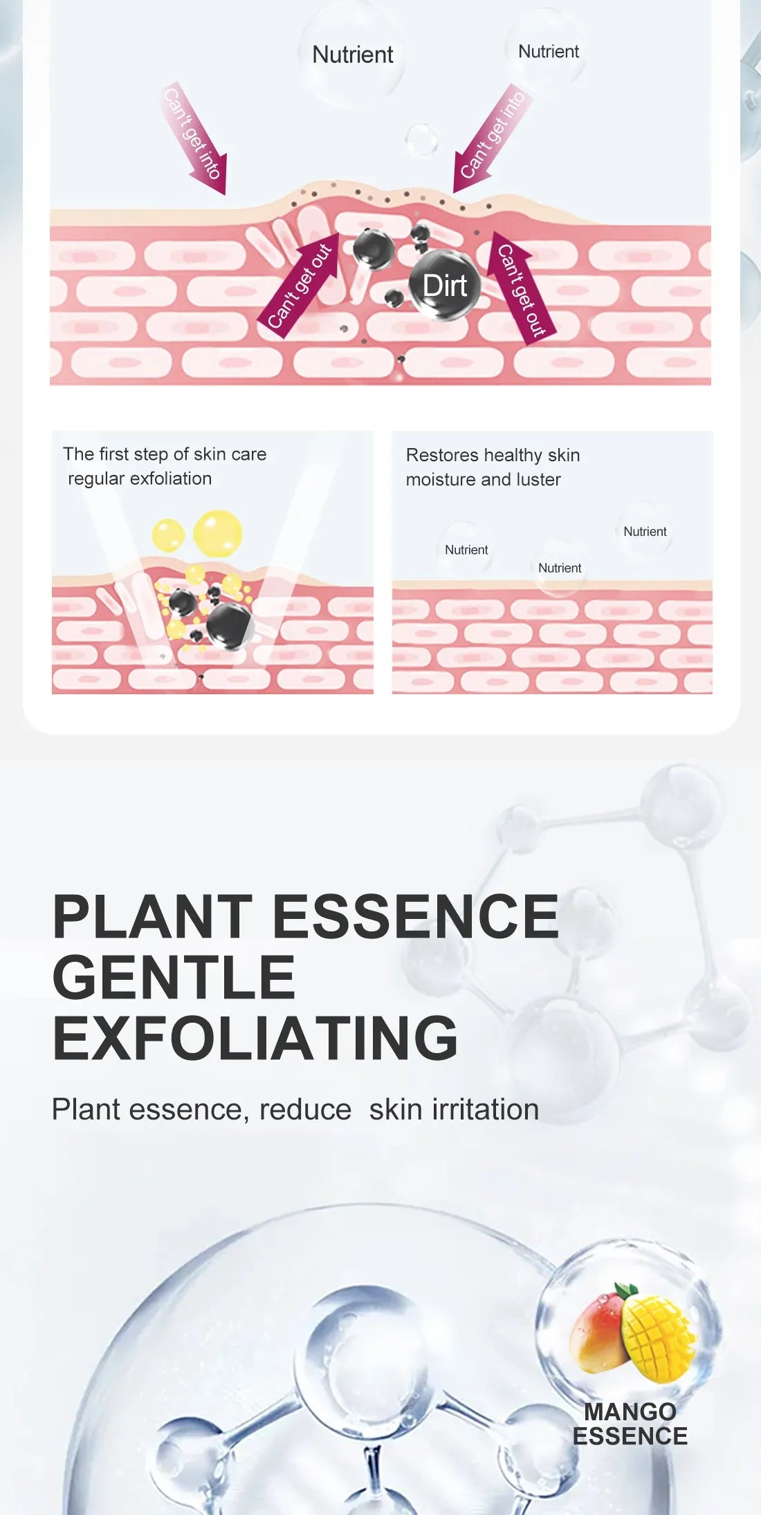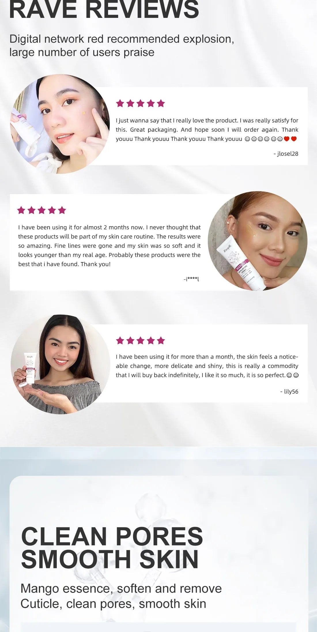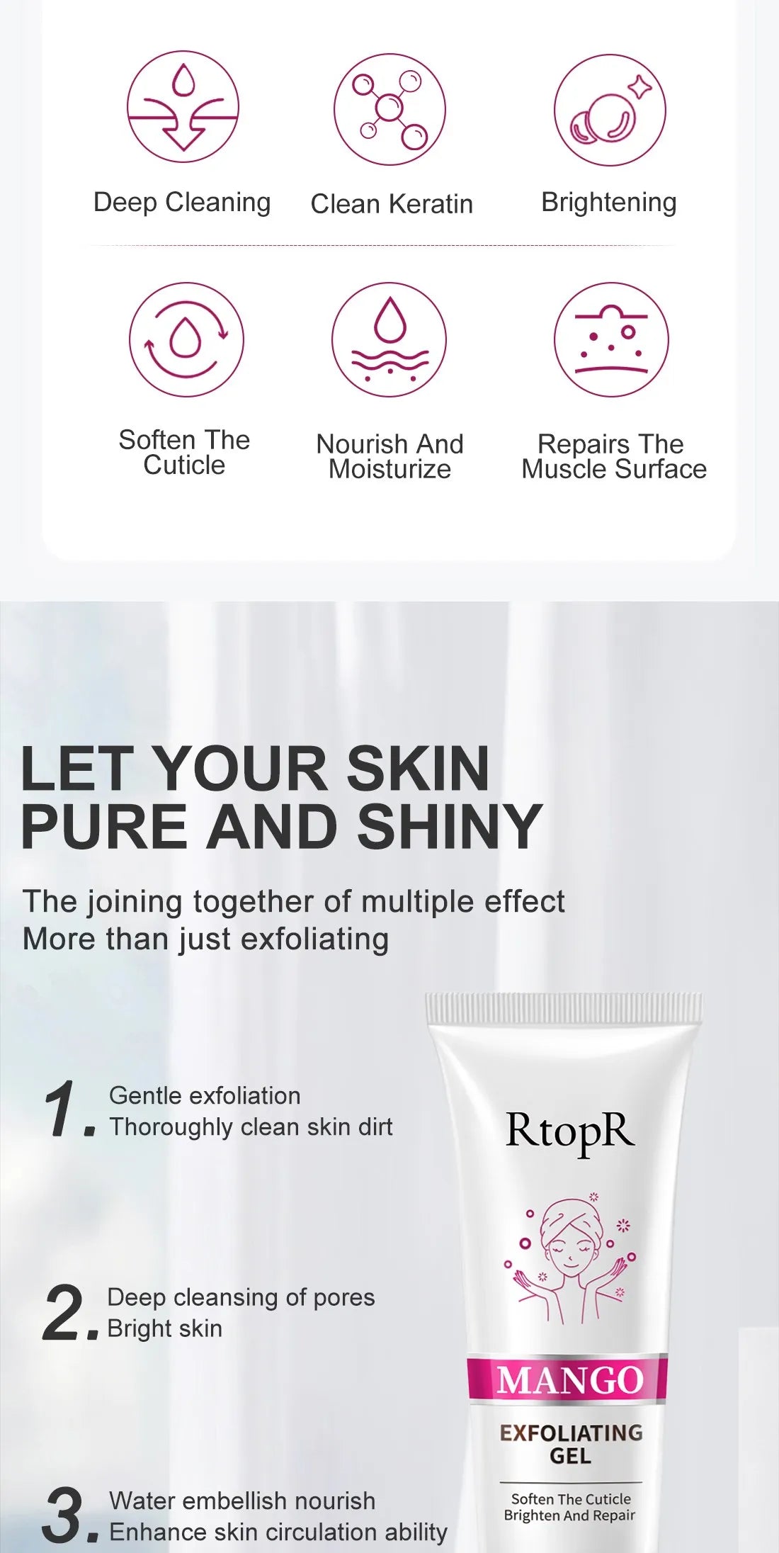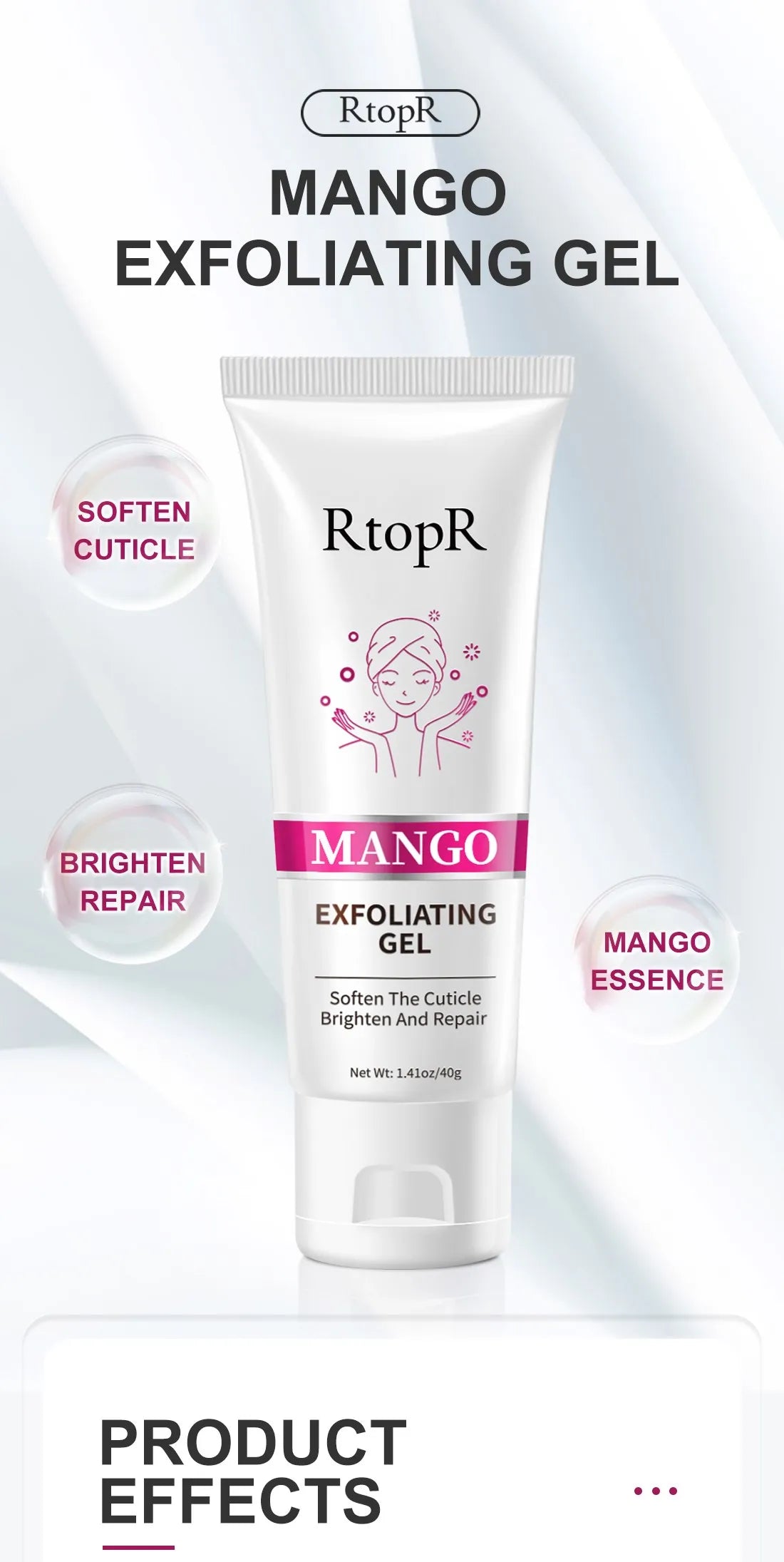 Gel texture,contains mango essence, helpssoft cuticle, removes old deadcutin, cleans and penetrates thedirt and greasy inside pores,increases the luster andpermeability of skin, and soothesand repairs the muscle surface,making skin pure and shiny.