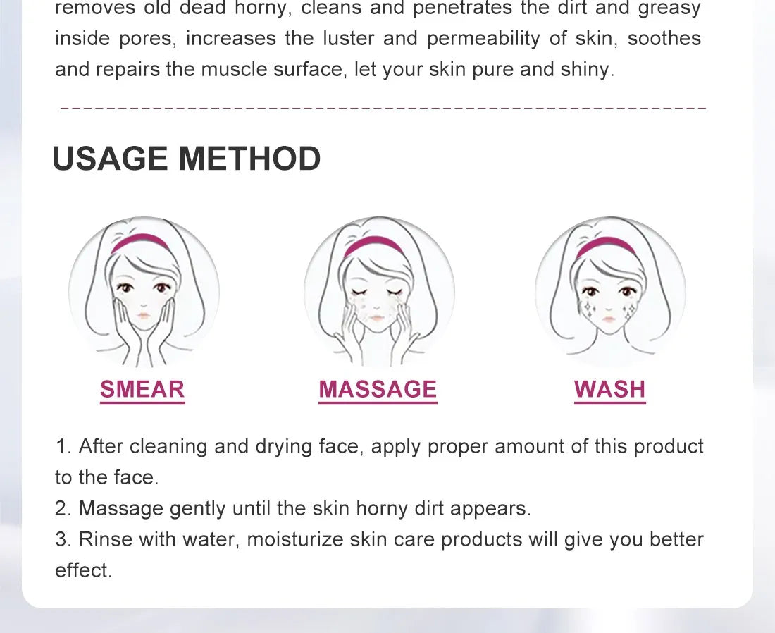 After cleansing and drying,apply proper amount of this productto the face, gently massage untilthe skin horny dirt appears, andthen rinse off with clean water.