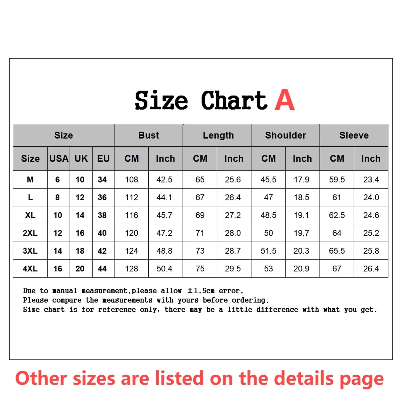 Tamaño: 4XL, Busto: 128 cm/50,4", Largo: 75 cm/29,5", Manga: 67 cm/26,4", Hombro: 53 cm/20,9" (Aprox.)